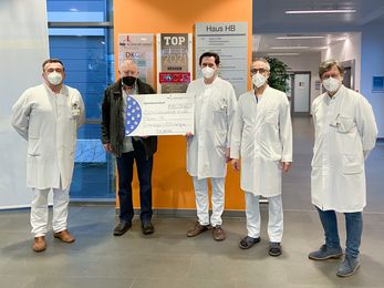 Auf dem Bild zu sehen (v.l.n.r.): Prof. Dr. med. Peter Langer, Chefarzt der Klinik für Allgemein-, Viszeral- und Thoraxchirurgie, der großzügige Spender Peter H., Dr. med. Ralph Siemer, leitender Oberarzt der Klinik für Allgemein-, Viszeral- und Thoraxchirurgie, Dr. med. Peter Immenschuh und PD Dr. med. Martin Burk, Oberarzt und Chefarzt der Klinik für Internistische Onkologie, Hämatologie und klinische Immunologie