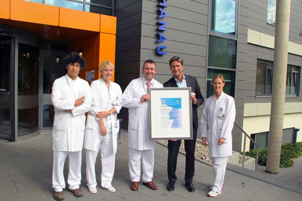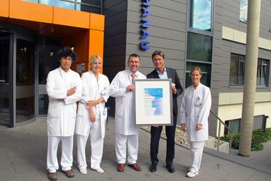 Der Geschäftsführer des Klinikums Hanau, Volkmar Bölke, übergibt dem Schilddrüsen-Team das Zertifikat als Kompetenzzentrum für Schilddrüsen- und Nebenschilddrüsenchirurgie. V.l.n.r.: Dr. med. Yuri Cruz-Candia, Dr. med. Yvonne-Marie Berkhoff, Prof. Dr. med. Peter Langer, Volkmar Bölke und Dr. med. Stefanie Wolak