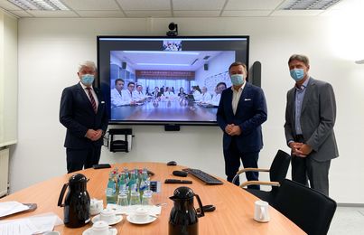 Spätestens seit dem Frühjahr des Jahres hat die Corona-Pandemie die Welt fest im Griff. Internationale Beziehungen sind gerade in diesen Zeiten besonders wichtig, auch wenn diese zurzeit nicht persönlich gepflegt werden können. Um Aufrechterhaltung dieser Beziehungen und vor allem um einen medizinischen Erfahrungsaustausch, ging es am vergangenen Freitag, 23. Oktober 2020, bei einem virtuellen Online-Meeting zwischen der Stadt Hanau und dem Klinikum Hanau mit Hanaus Partnerstadt Taizhou sowie dem Enze Major General Hospital in China. Die Idee und Initiative gingen bereits im letzten Jahr von PD Dr. med. Axel Eickhoff, Chefarzt der Klinik für Gastroenterologie, Diabetologie und Infektiologie, aus. Ein persönlicher medizinischer Austausch mit Besuch der chinesischen Delegation und acht Ärzten verschiedener Fachrichtungen am Klinikum Hanau war bereits für Anfang Februar dieses Jahres geplant, fiel jedoch kurzfristig der Corona-Pandemie zum Opfer. „Mir war es wichtig, gerade und insbesondere aufgrund der besonderen Situation, die wir global durch Corona haben, den Gesprächsfaden nicht abreißen zu lassen und einen medizinischen Wissenstransfer herzustellen. Denn nur gemeinsam, in enger Kooperation und im direkten Austausch, können wir dieser Pandemie Herr werden", so PD Dr. Eickhoff.