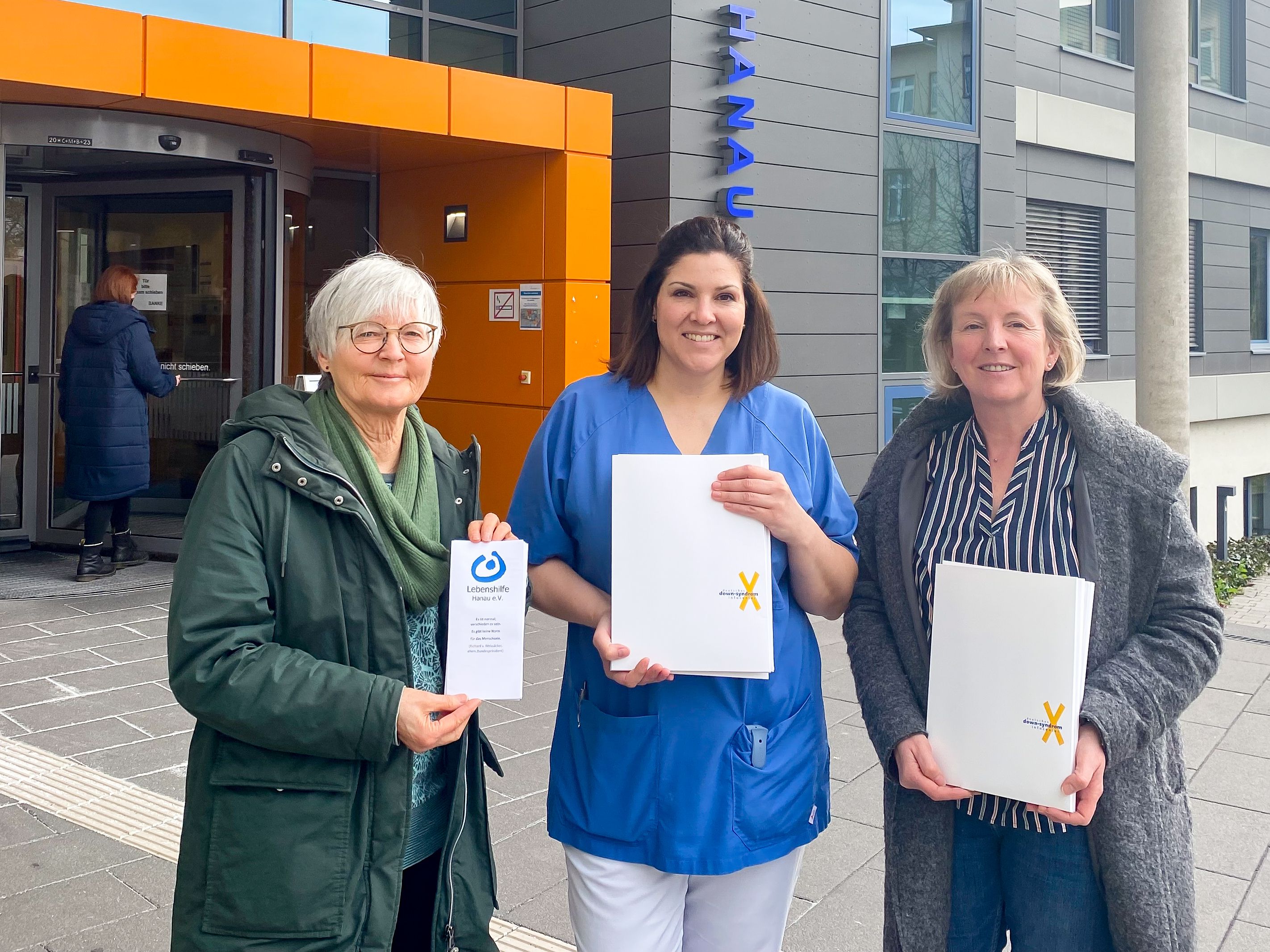 „Wenn man mit der Diagnose Trisomie 21 – Down Syndrom konfrontiert wird, kommen einem oft erst die negativen Aspekte, die mit der Beeinträchtigung verbunden sind, in den Sinn. Aber wenn ich heute sehe, was meine Tochter Lena doch alles kann, bin ich gespannt und freue mich auf alles, was noch kommt“, erzählt Silvia Brand. Anlässlich des Welt-Down-Syndrom-Tags am 21. März, hat sie zusammen mit der 1. Vorsitzenden des Vereins Lebenshilfe Hanau e.V., Lilo Schaffer, vier Erstinformationsmappen zum Thema Down-Syndrom im Klinikum Hanau vorbeigebracht und dort an das Eltern-Kind-Zentrum gespendet. Jede dieser Mappen des Deutschen Down-Syndrom Infocenters kostet 30 Euro, finanziert wurden sie aus Spenden, die der Verein für seine ehrenamtliche Arbeit bekommen hat. „Das Eltern-Kind-Zentrum am Klinikum ist oft Erstkontaktstelle für betroffene Eltern. Mit den Mappen können sich jetzt die, die sich mit dem Thema auseinandersetzen wollen oder auch müssen, umfassend informieren“, erklärt Schaffer. „Als ich damals mit Lena schwanger war, gab es leider noch nicht so viele Informationsmaterialien, um sich in Ruhe mit dem Thema zu befassen“, ergänzt Brand. Fachärztin Samira Sadaqi, die die Pränatalsprechstunde am Klinikum leitet, nahm die Exemplare entgegen, die auch die Ärztinnen und Ärzten bei der doch schwierigen Diagnosevermittlung unterstützen sollen. „Wir als Mediziner tragen hier eine große Verantwortung, insbesondere auch in der Perinatalmedizin. Umso mehr freut es mich, dass wir mit den Mappen vom Verein Lebenshilfe Hanau e.V. unterstützt werden und auch den Eltern etwas an die Hand geben können“, so Sadaqi.