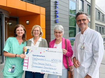 „Mit einem dreiviertel Jahrhundert wünscht man sich nicht mehr so viel“, erklärt Ursula Betz, als die den großen, symbolischen Scheck über 500 Euro an das Team des Fördervereins Sterntaler und den Chefarzt der Klinik für Kinder- und Jugendmedizin, Dr. med. Winfried Krill, übergibt. Anlässlich ihres 75. Geburtstags hatte sie ihre Gäste gebeten, auf Geschenke zu verzichten und stattdessen für den Verein zu spenden, der die Klinik für Kinder- und Jugendmedizin am Klinikum Hanau unterstützt.