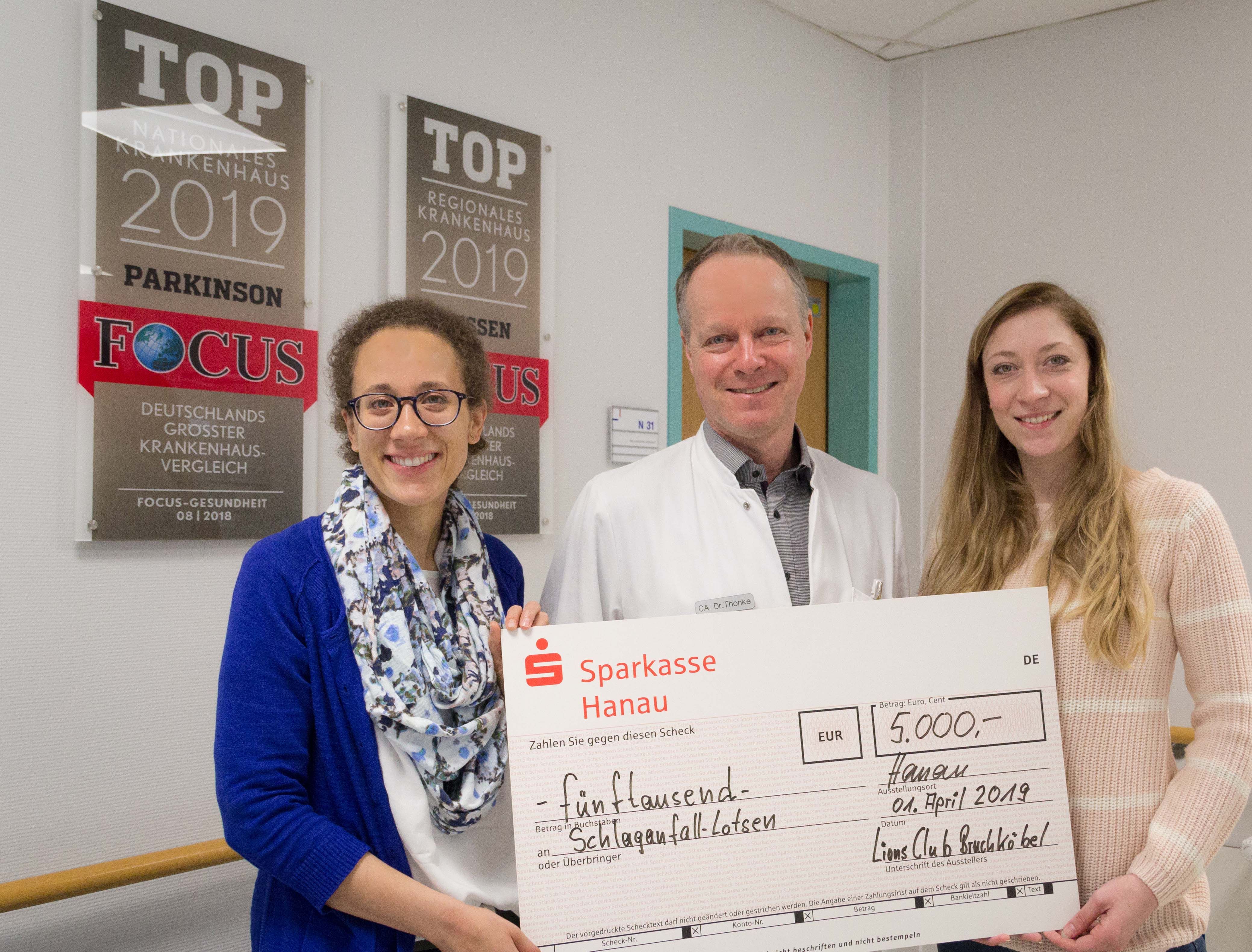 Sich den gesellschaftlichen Problemen der Zeit stellen und uneigennützig zu deren Lösung beitragen – unter diesem Motto arbeitet der Lionsclub Bruchköbel. Mehrmals jährlich organisiert der Verein deshalb Benefiz-Veranstaltungen, deren Erlös einem guten Zweck gespendet wird. So auch das große Konzert im Congress Park Hanau Anfang April, bei dem die Big Band der Bundeswehr die Besucher mit Hits aus Swing und Pop begeisterte. Insgesamt 12.000 Euro kamen dabei zusammen, einen Scheck über 5.000 Euro nahm Dr. med. Sven Thonke, Chefarzt der Klinik für Neurologie am Klinikum Hanau, am Konzertabend dankend entgegen. Das Geld wir dem neuen Schlaganfall-Lotsen Projekt „HANNS“ zugutekommen, bei dem sich seit November vergangenen Jahres zwei Schlaganfall-Lotsinnen um die ambulante Nachsorge von Schlaganfall-Patienten des Klinikum kümmern. „Wir haben uns sehr gefreut, dass sich der Lionsclub Burchköbel dafür entschieden hat, unser neues Projekt mit einer so großen Spende zu unterstützen“, so Thonke nach der Scheckübergabe.