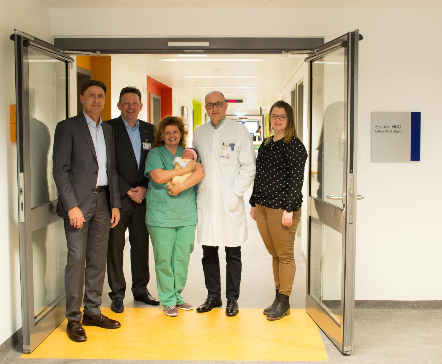 (v.l.n.r.) Volkmar Bölke, Geschäftsführer, Jens Relke, Leiter des Geschäftsbereichs 4 Technik & IT, Tatjana Nicin, Bereichsleitung der Geburtshilfe mit Aisha, die gemeinsam mit ihrer Mama zu den ersten Patienten der Station gehörte, PD Dr. med. Thomas Müller, Chefarzt der Klinik für Gynäkologie und Geburtshilfe und Elvira Nietsch, Projektmanagement Technik.