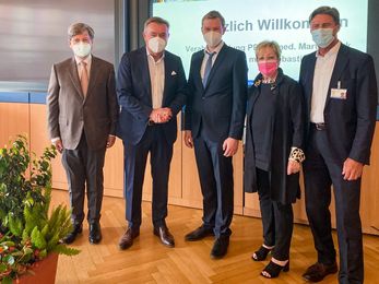 (v.l.n.r.): Der emeritierte Chefarzt PD Dr. med. Martin Burk, Oberbürgermeister und Aufsichtsratsvorsitzender Claus Kaminsky, der neu eingeführte Chefarzt Dr. med. Sebastian Wagner, Stadtverordnetenvorsteherin und Patientenfürsprecherin Beate Funck und der Geschäftsführer des Klinikums, Volkmar Bölke.
