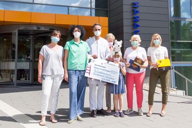 Auf dem Bild zu sehen (v.l.n.r.): Claudia Müller, pflegerische Bereichsleitung der K22, Cornelia Urbach, pflegerische Leitung der neonatologischen Intensivstation, Dr. med. Winfried Krill, Chefarzt der Klinik für Kinder- und Jugendmedizin, Susanne Löffler, Förderverein Sterntaler e.V., und Lara, Gabriele und Carina Markert.