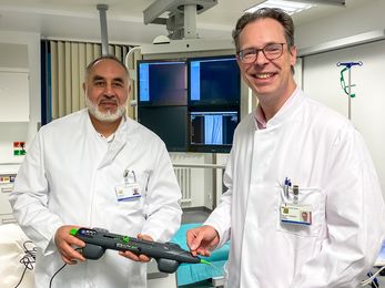 Der Sektionsleiter der interventionellen Radiologie, Nael Abusalim und der Chefarzt des Instituts für Diagnostische und Interventionelle Radiologie, Prof. Dr. med. Christopher Bangard, haben zusammen mit ihrem Team am Klinikum Hanau ein neues minimalinvasives Verfahren zur Behandlung von verkalkten Beingefäßen etabliert.