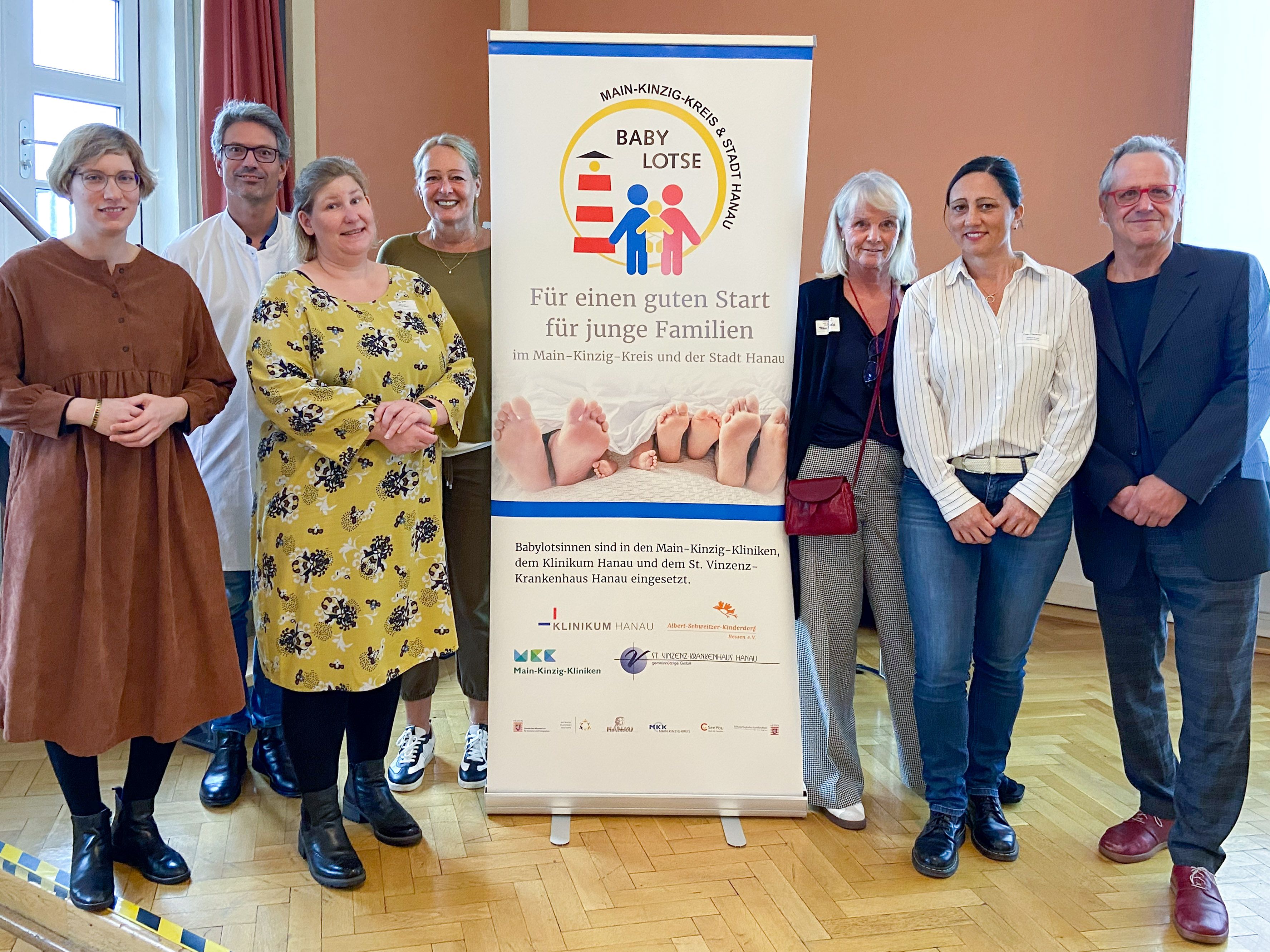 Auf dem Bild zu sehen (v.l.n.r.): Elke Schug, Netzwerkkoordinierende der Frühen Hilfen des Main-Kinzig-Kreises, Dr. med. Jens Kosse, Chefarzt der Klinik für Gynäkologie und Geburtshilfe am Klinikum Hanau, Sara Sell, Babylotsin am Klinikum Hanau, Andrea Pillmann, Netzwerkkoordinierende der Frühen Hilfen der Stadt Hanau, Martina Wichels, pflegerische Bereichsleitung des Eltern-Kind-Zentrums am Klinikum Hanau, Anja Hausner, Stillberaterin und Koordinatorin der Elternschule am Klinikum Hanau und Dr. med. Bernhard Bungert, Sektionsleiter der Neonatologie am Klinikum Hanau.