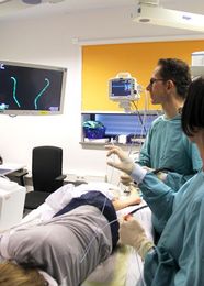 Rund eine Million Darmspiegelungen werden in Deutschland pro Jahr durchgeführt. Dabei klagen viele Patienten über ein unangenehmes Gefühl und Schmerzen unter der Bauchdecke. Das liegt unter anderem daran, dass sich der Darm mit dem Endoskop teilweise während der Behandlung in Schleifen legt. Aktuell zeigen Endoskope nur das Bild einer kleinen Kamera, die sich an der Spitze des Schlauchs befindet, aber nicht wie das Endoskop selbst im Darm und Körperinnern liegt. Deshalb ist es schwierig, diese Schleifenbildung zu antizipieren und zu vermeiden. Mit dem Scope Pilot, einer neuen Art des Endoskops, wird diesem Problem jetzt Abhilfe geschaffen. Mit einer Magnet-Resonanz-Technik können dem behandelnden Ärzten jetzt sogenannte „Hybridbilder“ auf den Monitoren angezeigt werden. Zum einen traditionell das Darminnere wie bei bisherigen Endoskopen bekannt, zum anderen aber auch die Figur und Lage des Darms im Körper in dreidimensionaler Darstellung. „Im Endoskopschlauch des Scope Pilot sind in regelmäßigen Abständen Magnetspulen integriert, die Signale an Magnetresonanzdetektoren senden. Damit kann dann die Lage des Schlauchs im Körper und so auch die Figur des Darms in 3D dargestellt werden“, erklärt Privatdozent Dr. med. Axel Eickhoff, Chefarzt der Klinik für Gastroenterologie, Diabetologie und Infektiologie, der auch an der Entwicklung des neuen Scope Pilot aktiv mitgewirkt hat. „Wir arbeiten mit dieser neuen Art des Endoskops also quasi mit einem Autopiloten, der uns eine mögliche Schleifenbildung direkt auf dem Bildschirm anzeigt. So können wir sie von vornherein vermeiden, was uns unserem ultimativen Ziel einer für die Patienten schmerzfreien Koloskopie einen großen Schritt näher bringt“, freut sich der Leiter der Klinik.