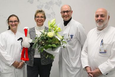 Hebamme Martina Craatz feiert ihr 40-jähriges Dienstjubiläum im Kreißsaal des Klinikums Hanau