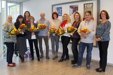 Karin Kilian, Gesundheits- und Krankenpflegerin in der Psychiatrischen Tagesklinik, Beate Planas-Ramon, Gesundheits- und Kinderkrankenpflegerin und stellvertretende Bereichsleitung der Pädiatrischen Notaufnahme und Jörg Heß, Fachkrankenpfleger im OP, feierten ihr 40-jähriges Dienstjubiläum. Hanane Ellahia, Gesundheits- und Krankenpflegerin, Maria Seibel, Gesundheits- und Krankenpflegerin, Sandra Wolf, Gesundheits- und Krankenpflegerin, Markus Franke, Fachkrankenpfleger Anästhesie, Anna Waszkiewicz, Gesundheits- und Krankenpflegerin und Katja Festner, Gesundheits- und Kinderkrankenpflegerin, feierten 25 Jahre Dienstzugehörigkeit am Klinikum Hanau.
