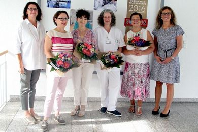 Die Jubilare wurden nun bei einer Feierstunde geehrt und bekamen als Dank eine Ehrenurkunde und Blumen überreicht. Geschäftsführer Volkmar Bölke, Petra Keckeis, Leitung Geschäftsbereich Personalservice, Esther Klug, Leitung Pflege- und Stationsmanagement, und Eva Maria Herget als Vertreterin des Betriebsrates sprachen ihre Anerkennung für die langjährige Zusammenarbeit aus.