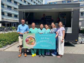 Hanau, 12. Mai 2024. Das Bild vor dem Klinikum ist an diesem Sonntag ein ungewöhnliches: Statt Autos steht auf dem Parkplatz der Foodtruck von Dudes Happyfood aus Rodgau sowie einige Sitzgelegenheiten. Inhaber Sören Tschab verteilt vegane, vegetarische oder Hühnchen-Bowls an die Mitarbeitenden des Klinikums, die gerade im Dienst sind. Unter dem Slogan „Sie sind incredi-Bowl“ ist die gesunde Stärkung ein herzliches Dankeschön der Klinikleitung an die Mitarbeitenden. „Natürlich sind wir immer dankbar dafür, dass Sie sich alle Tag für Tag für die Gesundheit unserer Patientinnen und Patienten einsetzen“, betont Esther Klug, Geschäftsbereichsleiterin des Pflege- und Stationsmanagements am Klinikum Hanau im Gespräch auf dem Parkplatz vor dem Klinikum. „Anlässlich des heutigen Internationalen Tags der Pflege möchten wir jedoch noch einmal ganz besonders unsere Wertschätzung zum Ausdruck bringen."