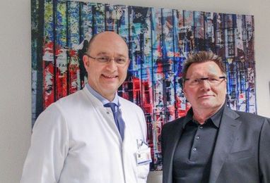 Das Fotokann unter Angabe der Quelle „Klinikum Hanau" verwendet werden. Auf dem Bild zusehen v.l.: Privatdozent Dr. med. Thomas Müller und Hans-Joachim Hummel bei der Eröffnung der Ausstellung Sight Acts im Klinikum Hanau