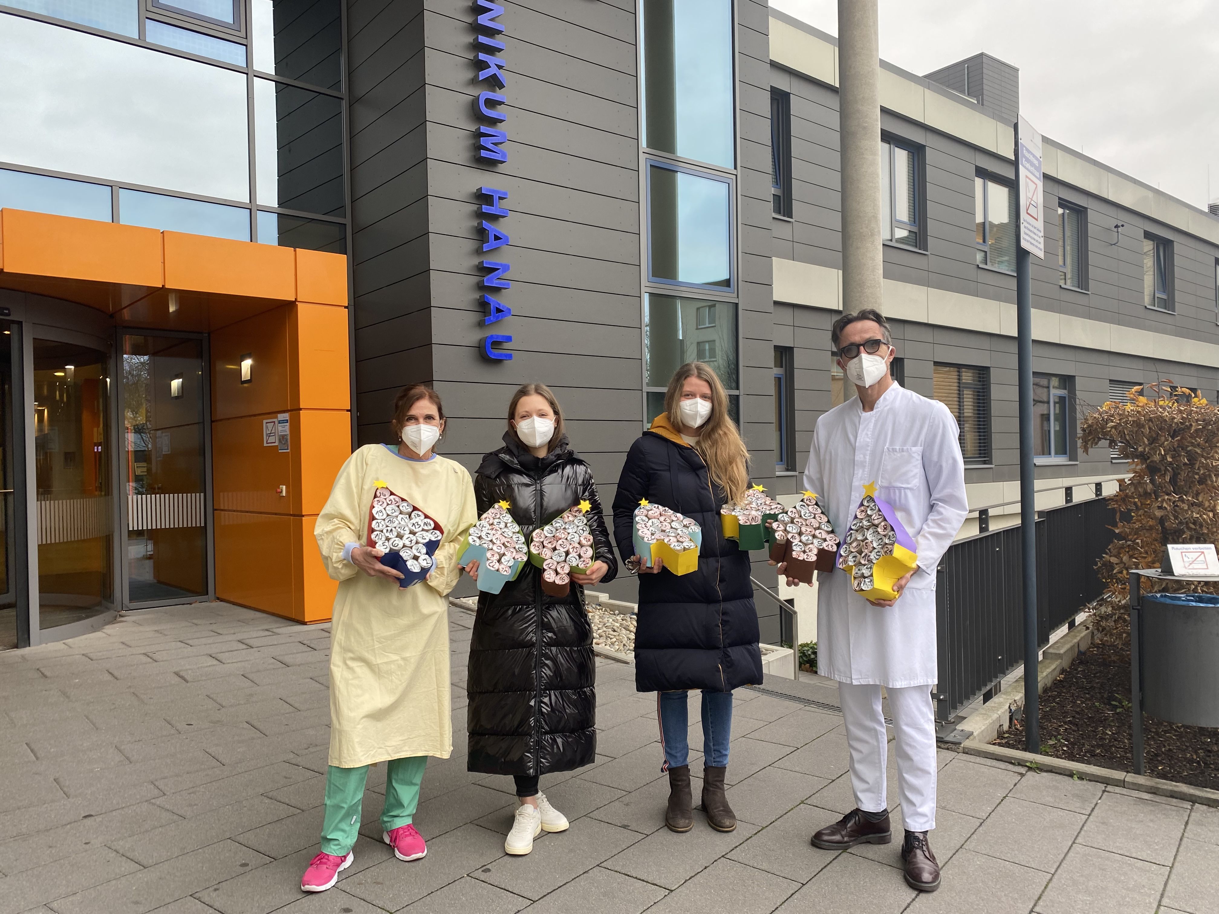 Die Weihnachtszeit möchte jeder gern mit seinen Liebsten gemütlich zuhause verbringen, den Kindern, die den Advent ganz oder teilweise in der Klinik für Kinder- und Jugendmedizin verbringen müssen, bleibt das leider verwehrt. „Den Advent im Krankenhaus verbringen zu müssen, ist für niemanden schön. Deswegen haben wir uns auch von Corona nicht aufhalten lassen und den kleinen Patienten ihren Aufenthalt auch dieses Jahr wieder mit selbstgebastelten Adventskalendern versüßt“, sagt Myriel Dinkel vom Rotaract Club Hanau. Sieben bunte Weihnachtsbäumchen mit je 24 gefüllten Türchen hat Myriel Dinkel jetzt zusammen mit Katharina Kötter von Rotaract Hanau stellvertretend für alle Beteiligten zum siebten Mal in Folge, an den Förderverein Sterntaler e.V. und damit an die Klinik für Kinder- und Jugendmedizin des Klinikums Hanau, übergeben.