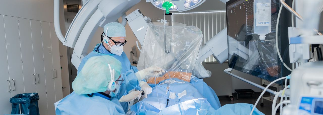 Unsere neu gegründete Medizinische Klinik IV – Rhythmologie stellt eine ideale Ergänzung zur Medizinischen Klinik I – Kardiologie, Angiologie, Pneumologie, Nephrologie und internistische Intensivmedizin dar, mit deren Team wir Hand in Hand arbeiten. In der Medizinischen Klinik IV halten wir das gesamte Spektrum der interventionellen Elektrophysiologie vor. Neben der konventionellen Ablation, z.B. bei AV-Knoten-Reentrytachykardien, steht uns eine 3D-Mappingtechnologie der neuesten Generation zur Behandlung komplexer Rhythmusstörungen zur Verfügung. Dadurch können die Herzkammern originalgetreu abgebildet werden. Zudem können Informationen zur Erregungsausbreitung ebenso wie narbige Veränderungen graphisch dargestellt werden. Dies ermöglicht eine exakte Analyse und Behandlung der vorliegenden Rhythmusstörung unter Berücksichtigung der individuellen Veränderungen des Herzens. Neben der Behandlung von Vorhofflimmern bzw. Vorhofflattern in der linken Vorkammer können damit auch Kammerrhythmusstörungen, z.B. nach einem Herzinfarkt, behandelt werden. Die kontinuierliche Anpressdruckmessung der verwendeten Katheter erhöht dabei die Sicherheit und Effektivität der Behandlung.