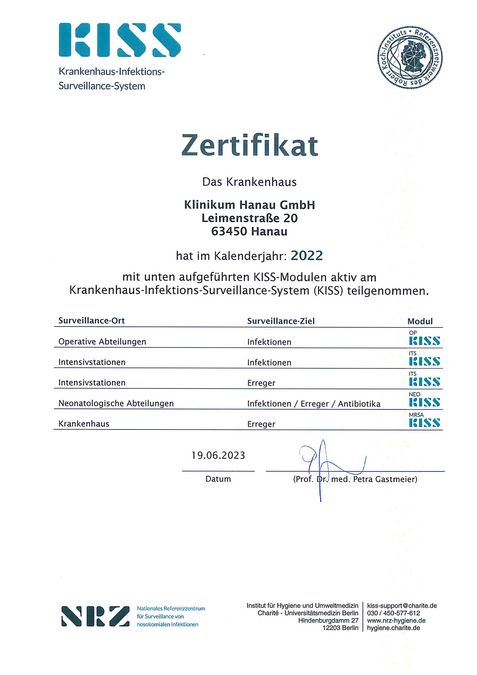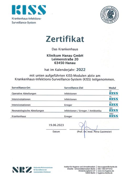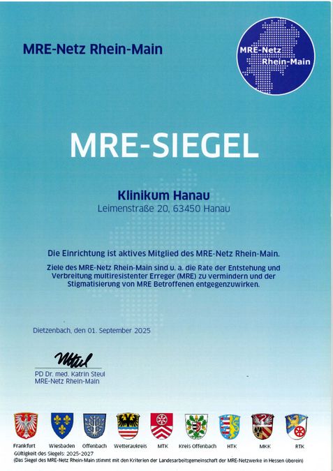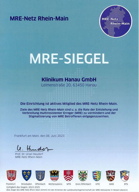 Unser Hygieneteam besteht aus einem festangestellten Facharzt für Mikrobiologie, Virologie und Infektionsepidemiologie, Zusatzbezeichnung Krankenhaushygiene, zwei Hygienefachkräften sowie einem Hygieneingenieur. Darüber hinaus steht uns ein Arzt für Hygiene und Umweltmedizin eines externen Instituts für Krankenhaushygiene und Infektionskontrolle beratend zur Seite. Weiterhin verfügen alle Fachabteilungen des Hauses über hygienebeauftragte Ärzte und Pflegekräfte. Es besteht eine enge Zusammenarbeit mit den öffentlichen Gesundheitsbehörden. Weiterhin ist das Klinikum Hanau Mitglied im MRE-Netz Rhein-Main.